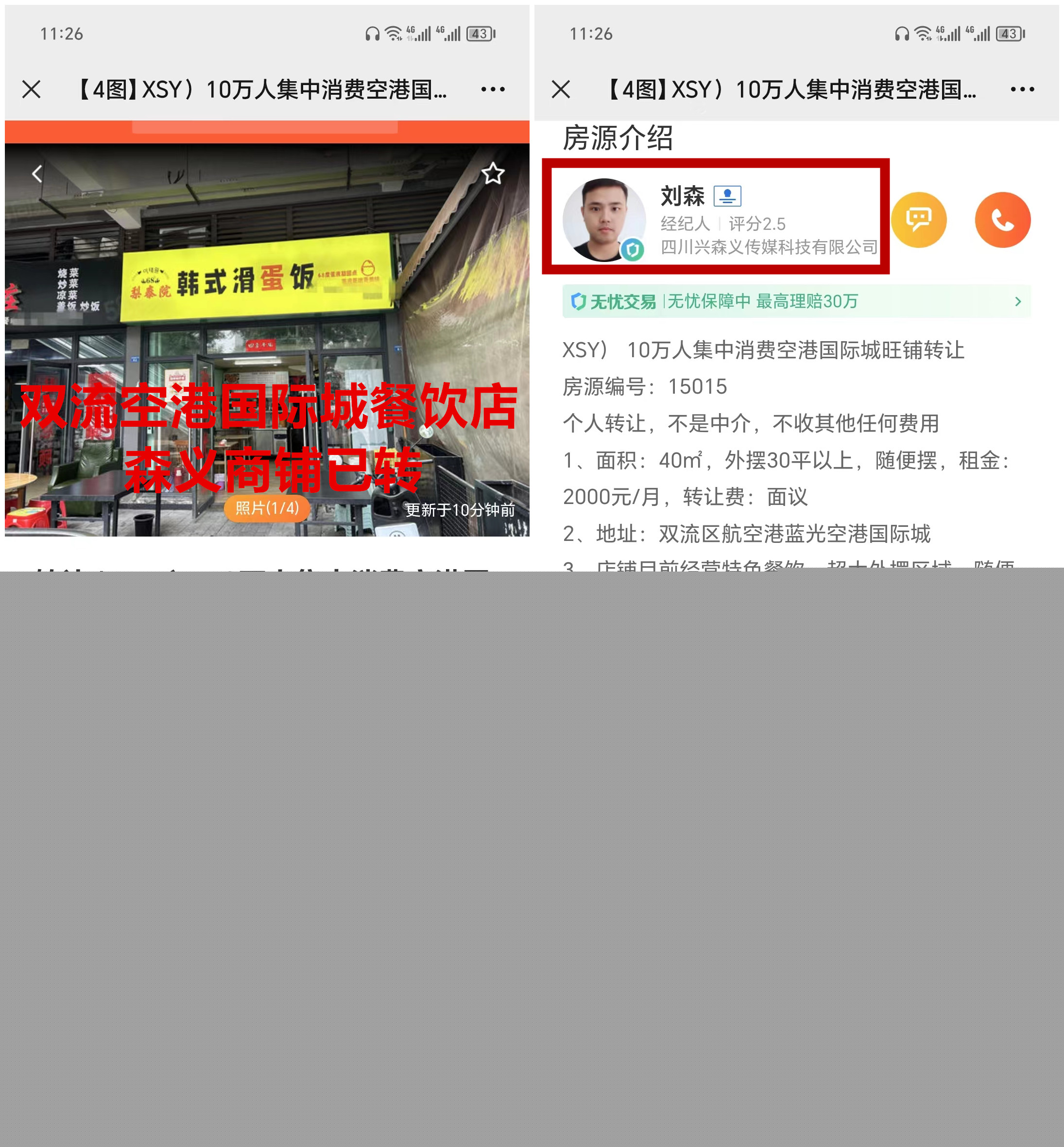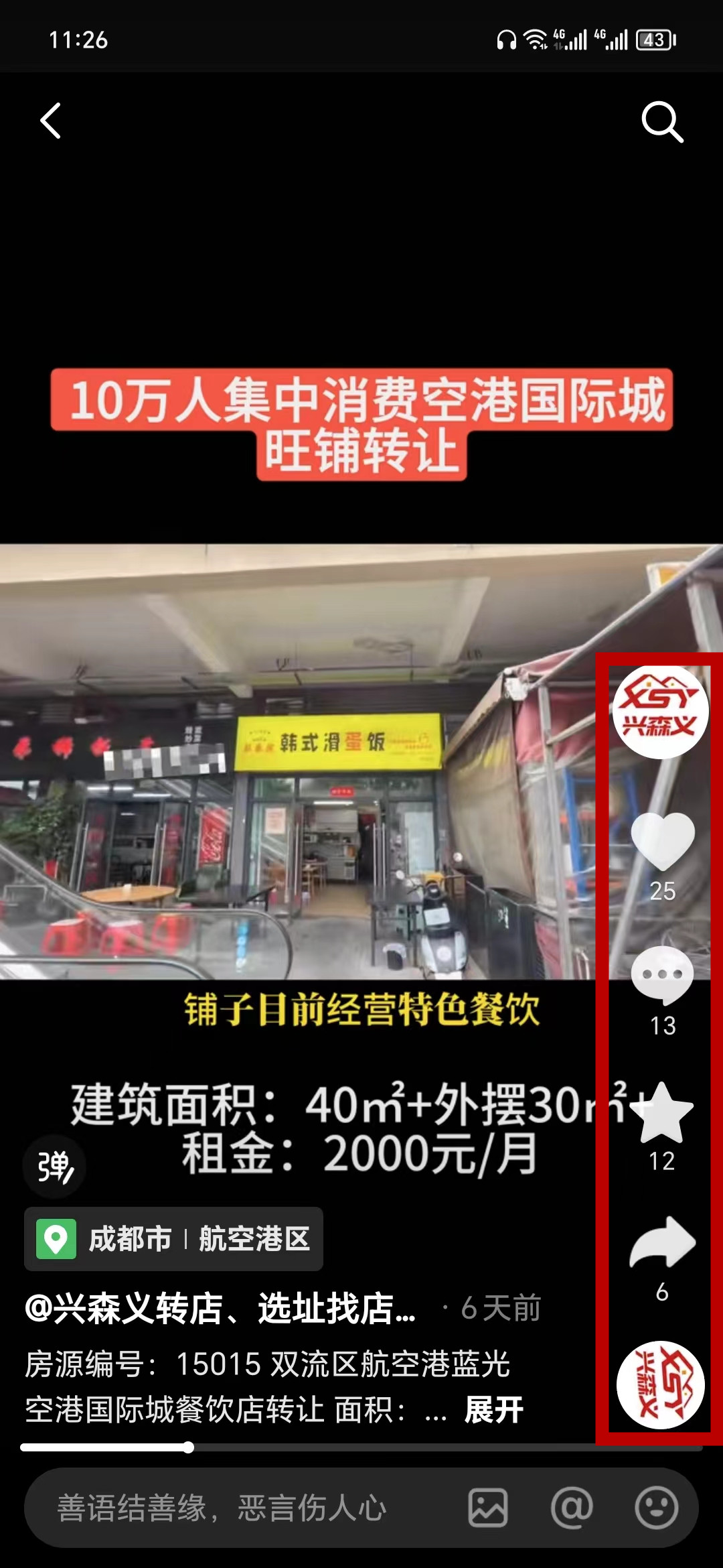 双流区航空港蓝光空港国际城餐饮店已转让