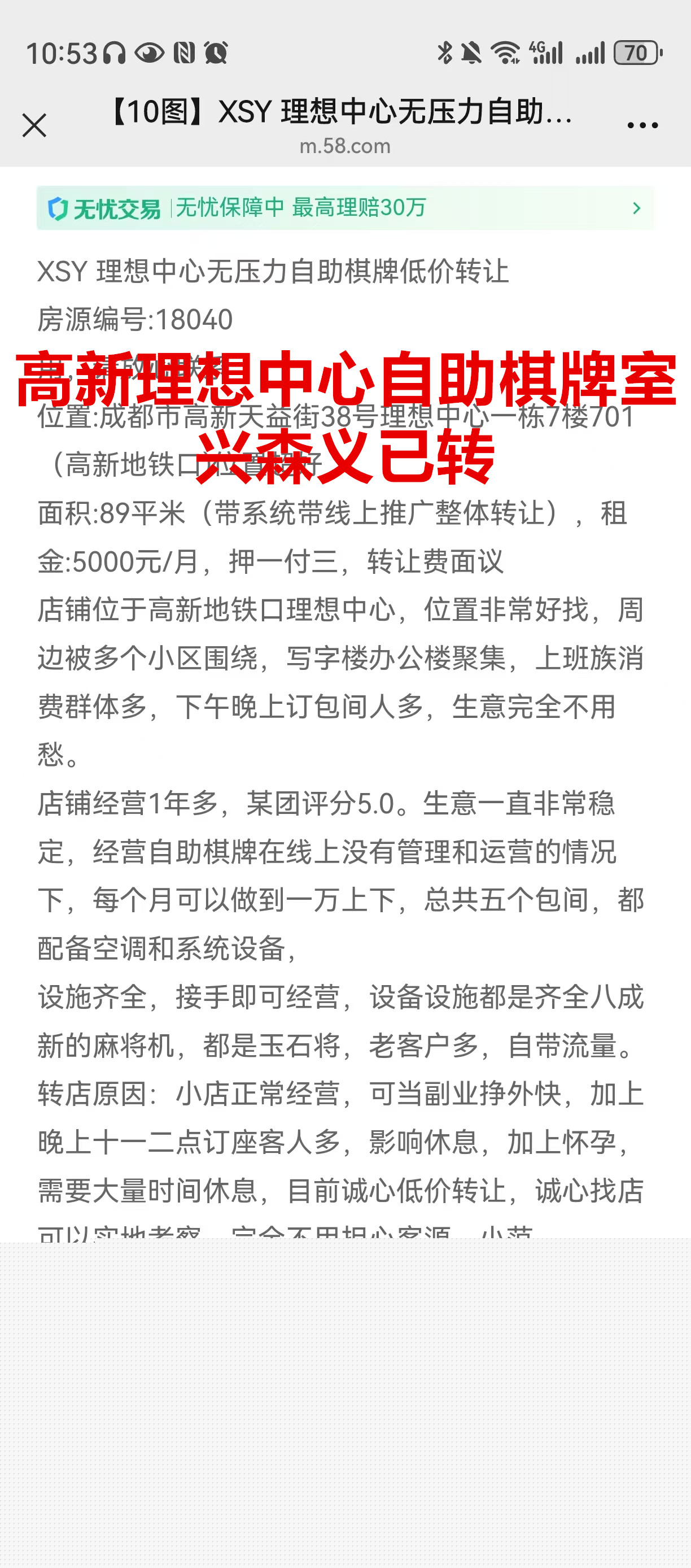 高新天益街理想中心一栋自助棋牌室已转让