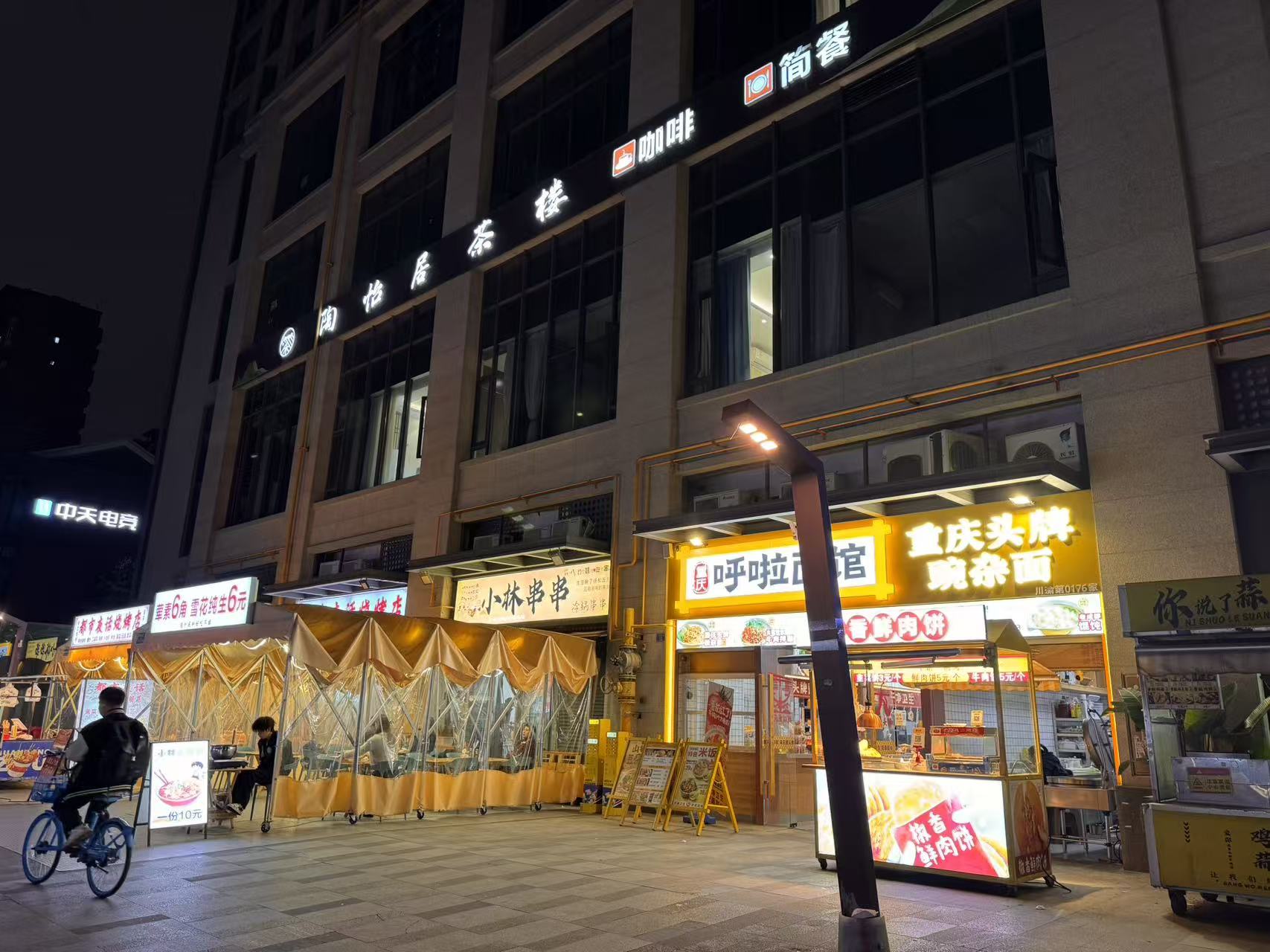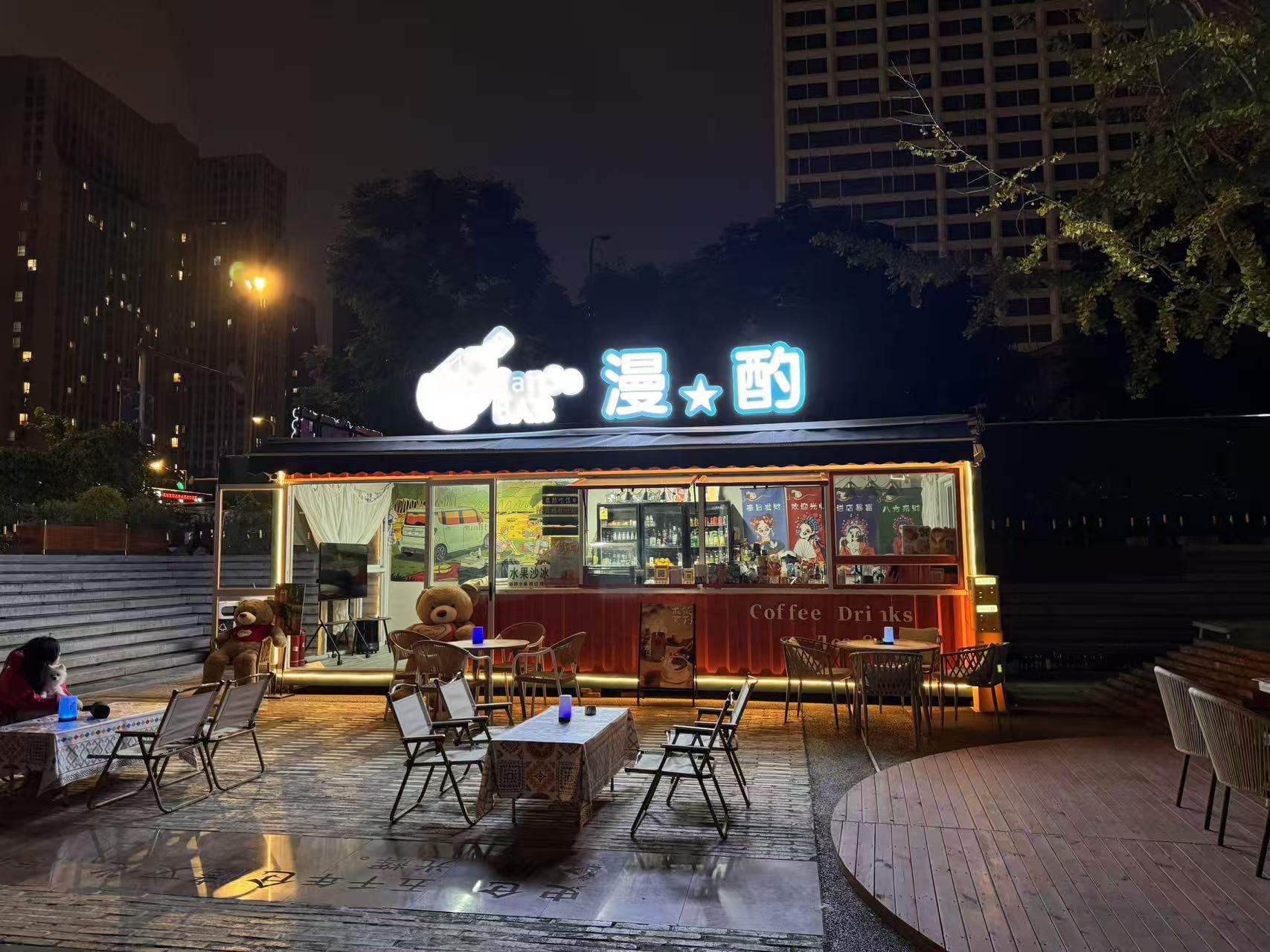 店子招牌显眼,装修精致,设备设施齐全, 证件齐全,开间大,带有超大外摆,现在经营日咖夜酒,小吃咖啡奶茶,有上下水!