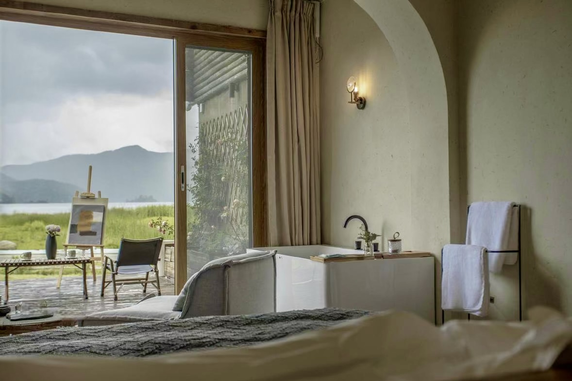 2、店铺情况:整个民宿花了600万高端装修,分为两栋楼。一栋为民宿房间,湖景房共15个,其中11个是正湖景大床房,3个是侧湖景双床房,1个活动室可改民宿房间,均价1300左右一间,旺季房价3000一晚,另一栋为160平接待大厅和餐厅,有两层楼可使用; 设施设备齐全,全屋智能控制系统,带智能卫浴,100寸极米投影,全屋水暖系统等,证件齐全,带消防,特行证,还有员工房3间,布草间,库房等,私家停车场也是有的,还有充电桩,开业以来老客户也很多,可带资源一起转,同行接手即可营业。
