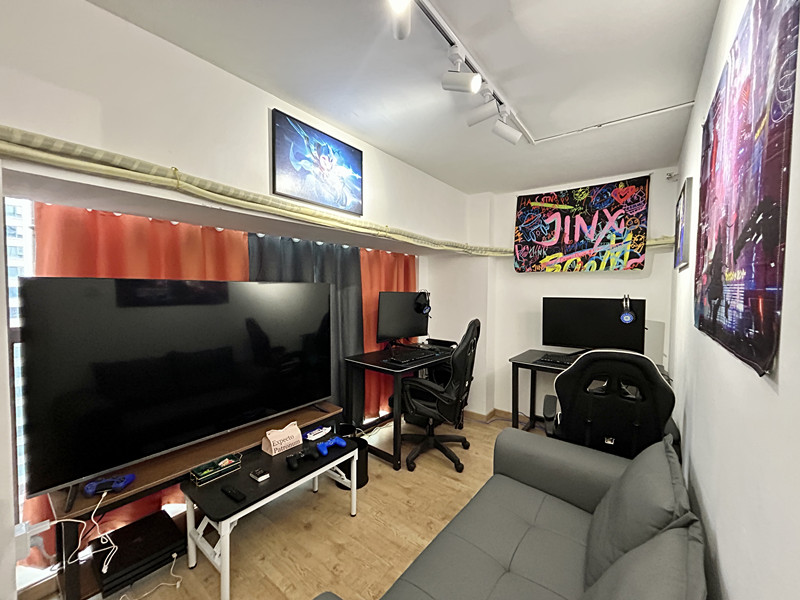 显示设备:1台86寸电视+2台65寸电视+2台55寸电视机+1个80寸左右的玻纤幕布+2台300hz高刷电脑显示屏,猫爪皮沙发+4个高端麻将椅+2个电竞椅+2个榻榻米。