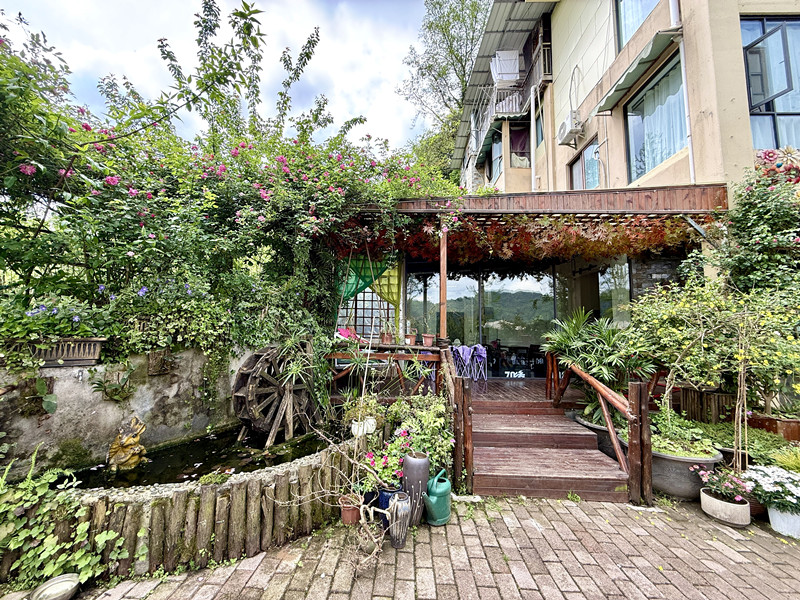 2、店铺情况:度假民宿依山而建,丽江风格打造,整个院子被绿意萦绕,种满了很多品种的绿植,空气特别的好,负氧离子 能达到3.2万 个,而且正朝日出方向,天气好可以看日出。晚上赏月品茶,民宿共四层,带有房间14个,2个备用房,超大餐厅,会议室,超大庭院,4-6月份蔷薇花爆满整个院子,是拍照打卡的网红店,是青城后山一颗耀眼的星光,厨房带有水电气三通,而且民宿后院拥有1000多平的超大绿色森林,里面被一棵千年的紫藤围绕,风景非常的好,目前用作棋牌喝茶和特色柴火鸡部分,后期可以加私汤或者是小木屋玻璃房,改造空间特别大,老板经营多年,老客户特别的多,同行接手就是旺季。