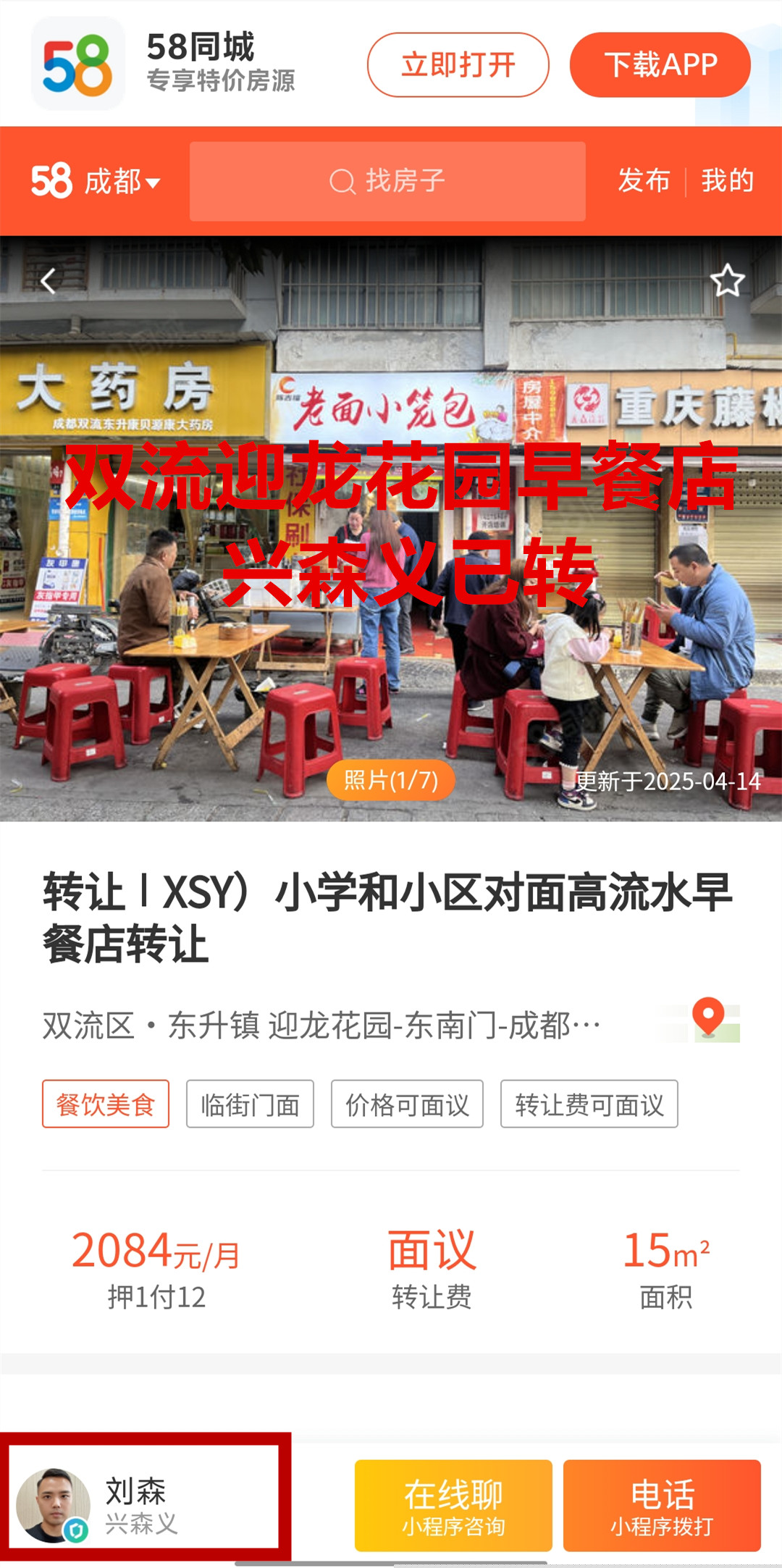 双流东升镇迎龙花园东南门早餐店已转让