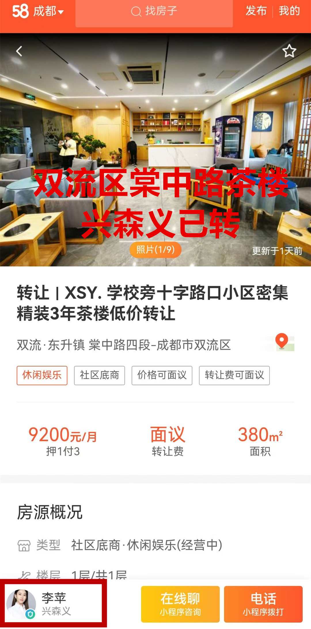 双流区棠中路茶楼已转让