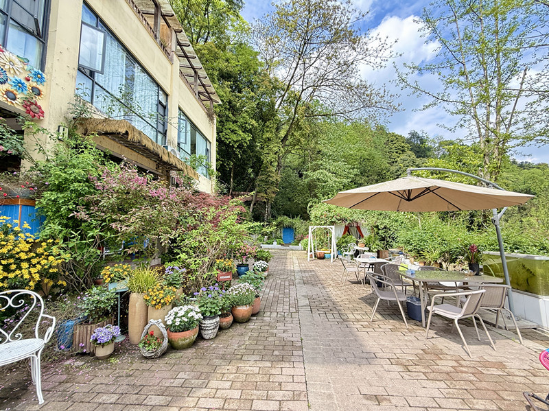 2、店铺情况:度假民宿依山而建,丽江风格打造,整个院子被绿意萦绕,种满了很多品种的绿植,空气特别的好,负氧离子 能达到3.2万 个,而且正朝日出方向,天气好可以看日出。晚上赏月品茶,民宿共四层,带有房间14个,2个备用房,超大餐厅,会议室,超大庭院,4-6月份蔷薇花爆满整个院子,是拍照打卡的网红店,是青城后山一颗耀眼的星光,厨房带有水电气三通,而且民宿后院拥有1000多平的超大绿色森林,里面被一棵千年的紫藤围绕,风景非常的好,目前用作棋牌喝茶和特色柴火鸡部分,后期可以加私汤或者是小木屋玻璃房,改造空间特别大,老板经营多年,老客户特别的多,同行接手就是旺季。