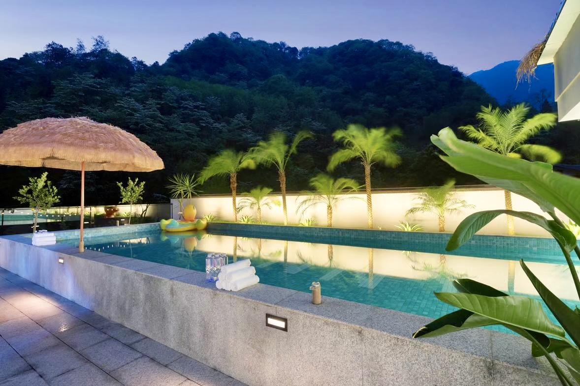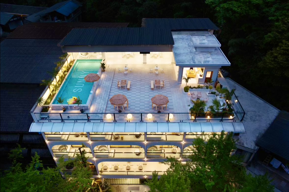 2、店铺情况:民宿全新1000万打造,共五层楼,两栋楼,房间共26间(其中18个房间带有私汤),楼顶有超大6×18米的网红泳池,露台也特别大,适合各种高级私人包院聚会,整体全部高级定制北欧风简约装修,房价自然也卖的高,旺季基本都是1000多一间,最贵的房间都是2000多,携程平台4.9分无差评,带有独立电梯,证件齐全,还有宴会厅,餐厅,水吧,书吧,会议室,儿童玩耍区域,平时可容纳几十个人的团建,一楼还带有棋牌室,接待大厅,后期都可以增加房间,院内停车场也有,而且还带有私家千瓦供电系统,上百吨的储水系统,可以说在青城山只此一家,马上正直旺季,接手即可经营。
